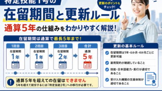 特定技能1号 特定技能1号の在留期間と更新ルール|通算5年の仕組み 特定技能1号の在留期間は1回最長1年・通算5年が上限です。更新手続きの流れ、必要書類、「通算5年」の正しい計算方法、5年満了後の選択肢(特定技能2号への移行など)を企業担当者にもわかりやすく解説します。 特定技能1号